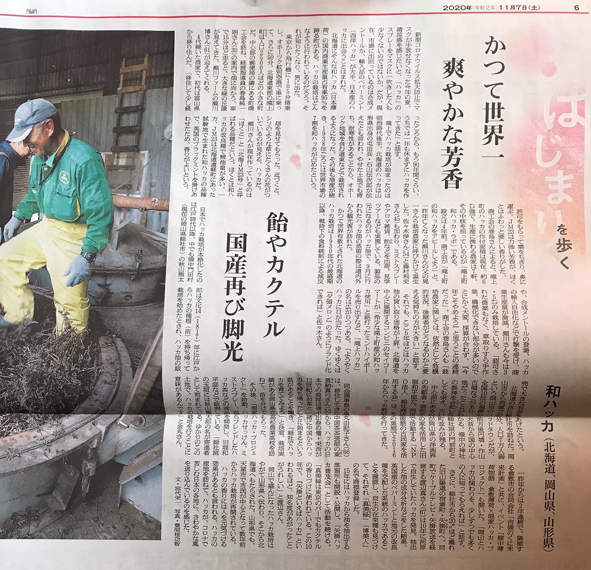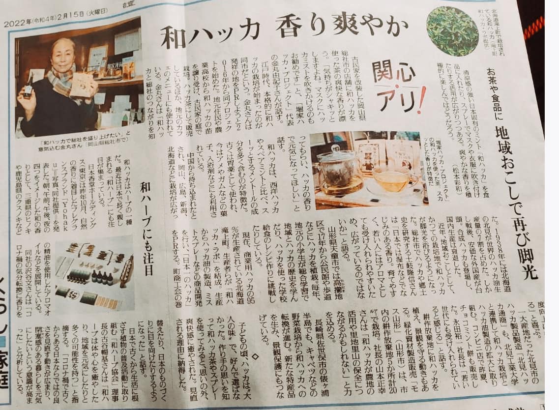 - 万能のハーブであるハッカの効能が再び見直されて注目を集め、各地でハッカ再興の動きが起こっている。ハッカ栽培増反やハッカの活用、商品の開発が進められている。