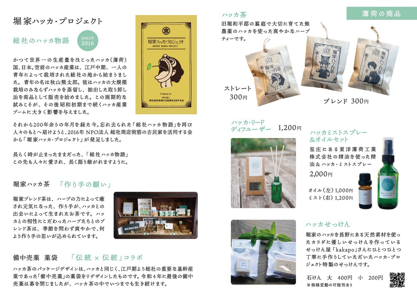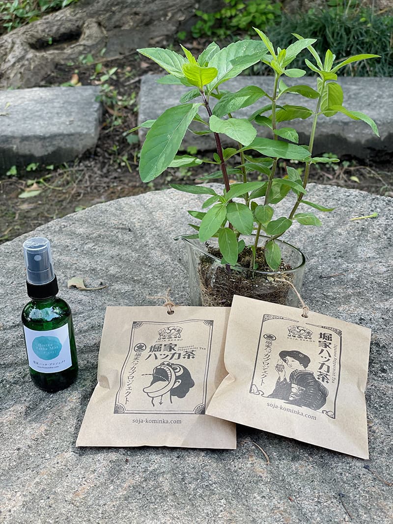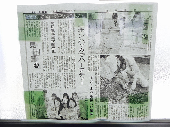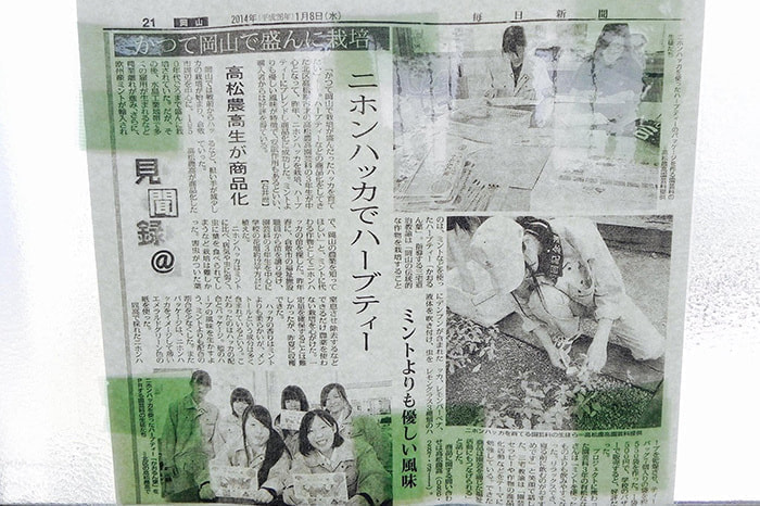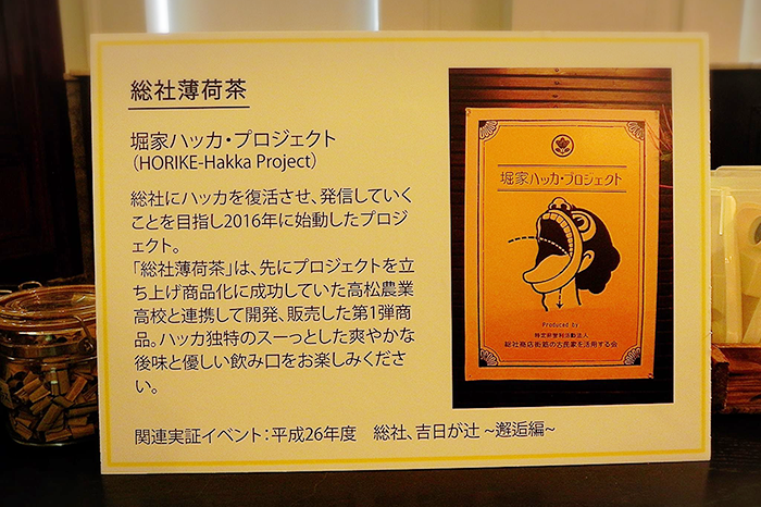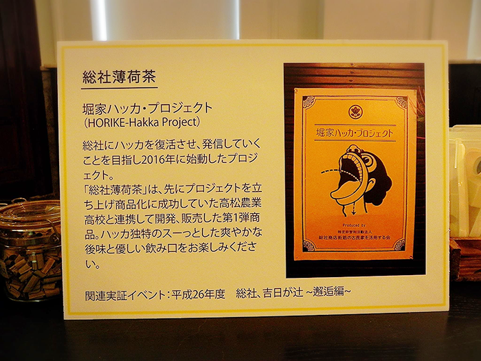先ずその第一弾として、先にプロジェクトを立ち上げ商品化にまで成功させている岡山高松農業高等学校と連携して、ハッカを使ったハーブティーの販売。そしてハッカドリンクを気軽に飲める場所としての「ほり茶館」オープン。