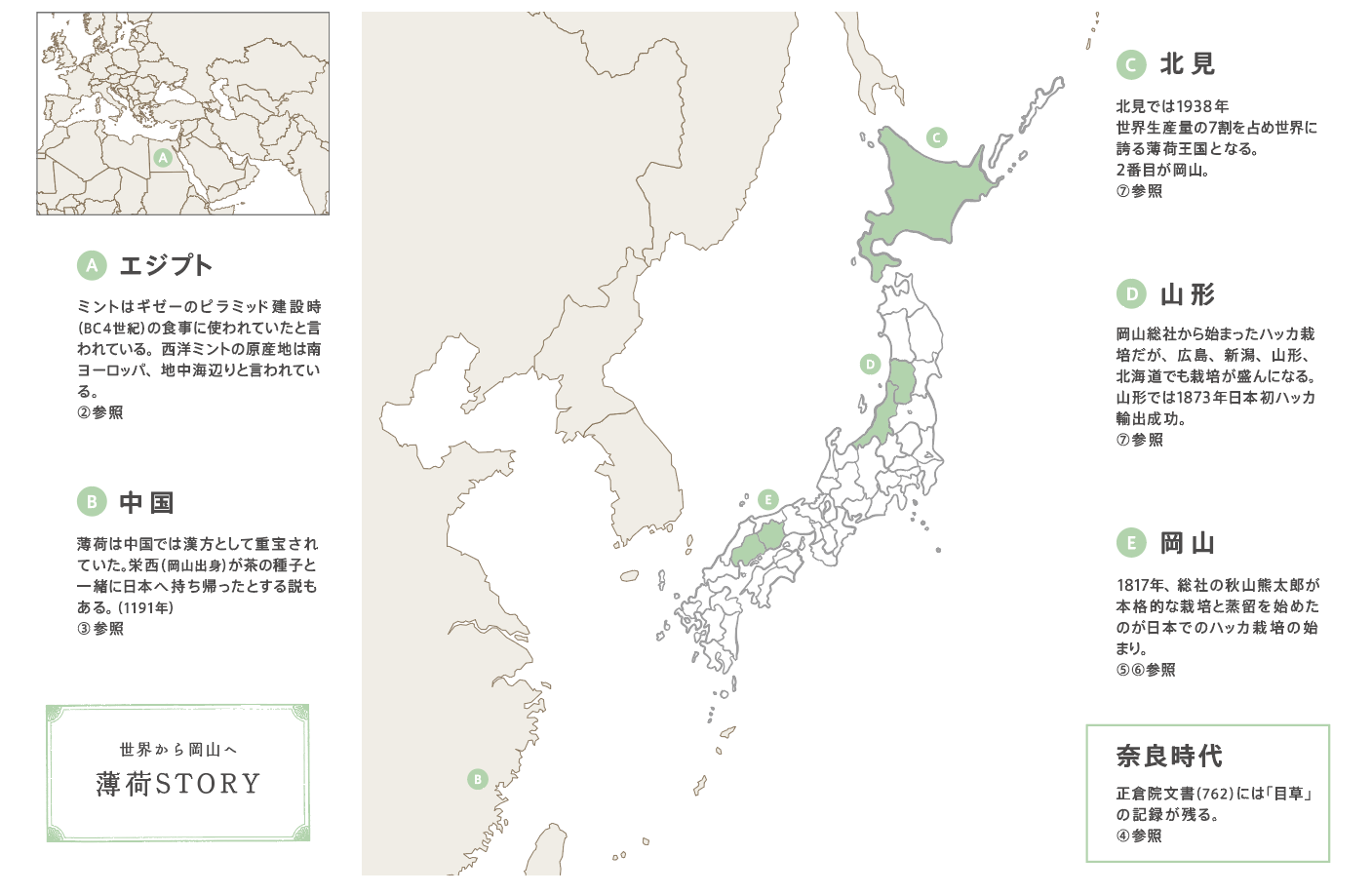 - 一説には臨済宗の祖、栄西(岡山賀陽町出身)が1191年に大陸からお茶の種子と共にハッカも持ち帰ったとする説もある。
