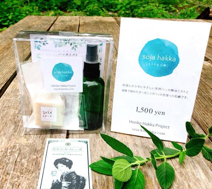 総社の名前が入った「SOJAはっかせっけん」は、煮出した堀家ハッカとオリーブオイル100%を加えたもの。油を傷めず保湿成分を残すよう低温で2ヶ月かけて丁寧に作られた心のこもったせっけんです。
